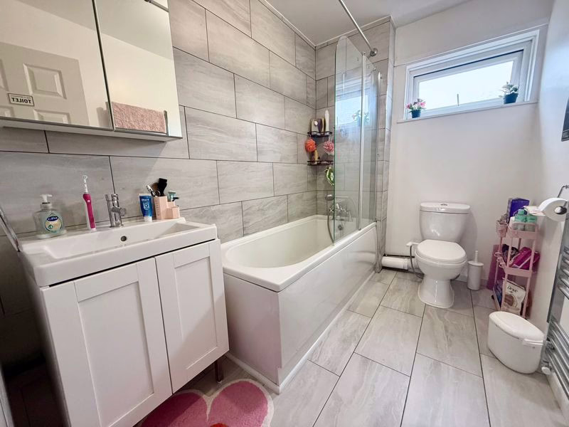 UPVC double glazed frosted window to front aspect. Pedestal wash hand basin, part tiled walls, low level WC with push button flush, heated towel rail, panelled bath with mixer tap and shower attachment.