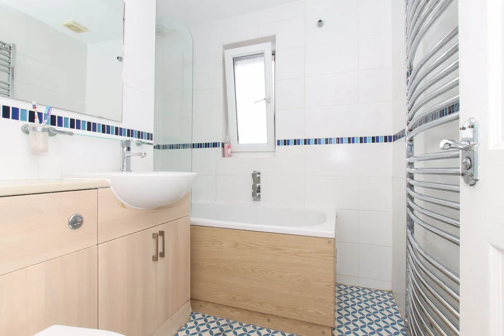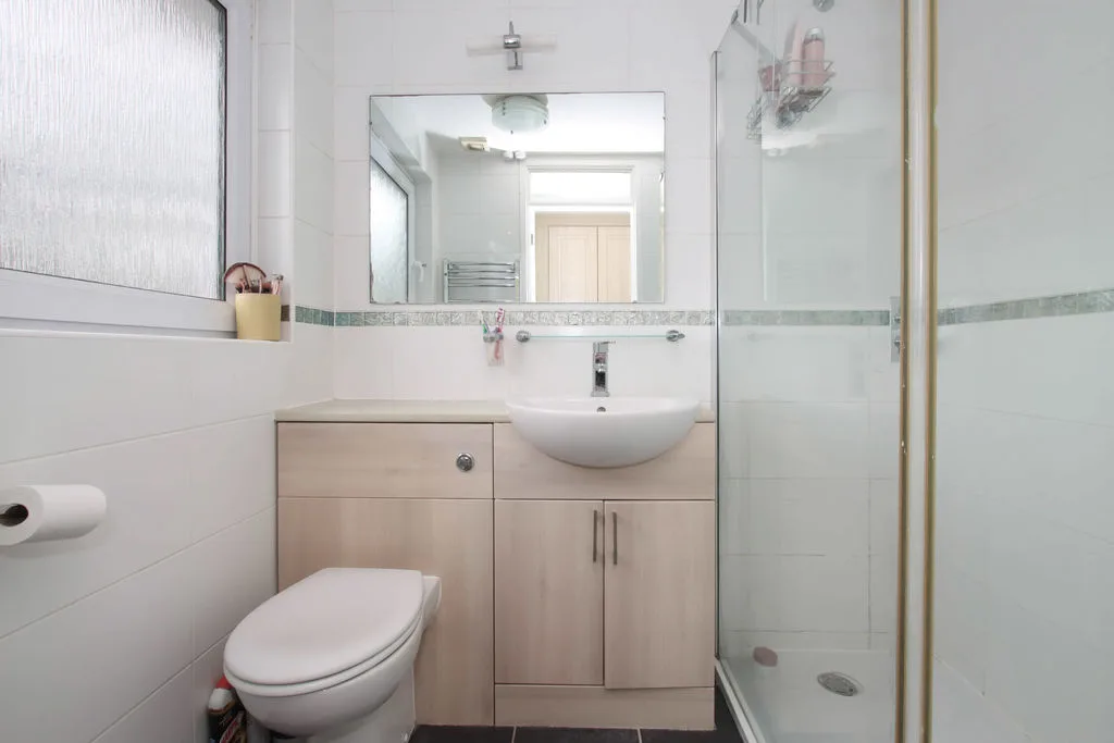Frosted double glazed window to front, WC, shower unit, heated towel rail, hand wash basin in vanity unit, extractor fan.