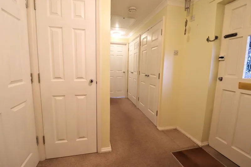 Doors to lounge, bedrooms and bathroom, airing cupboard housing hot water tank and linen storage, two storage cupboards, loft access, electric storage heater.