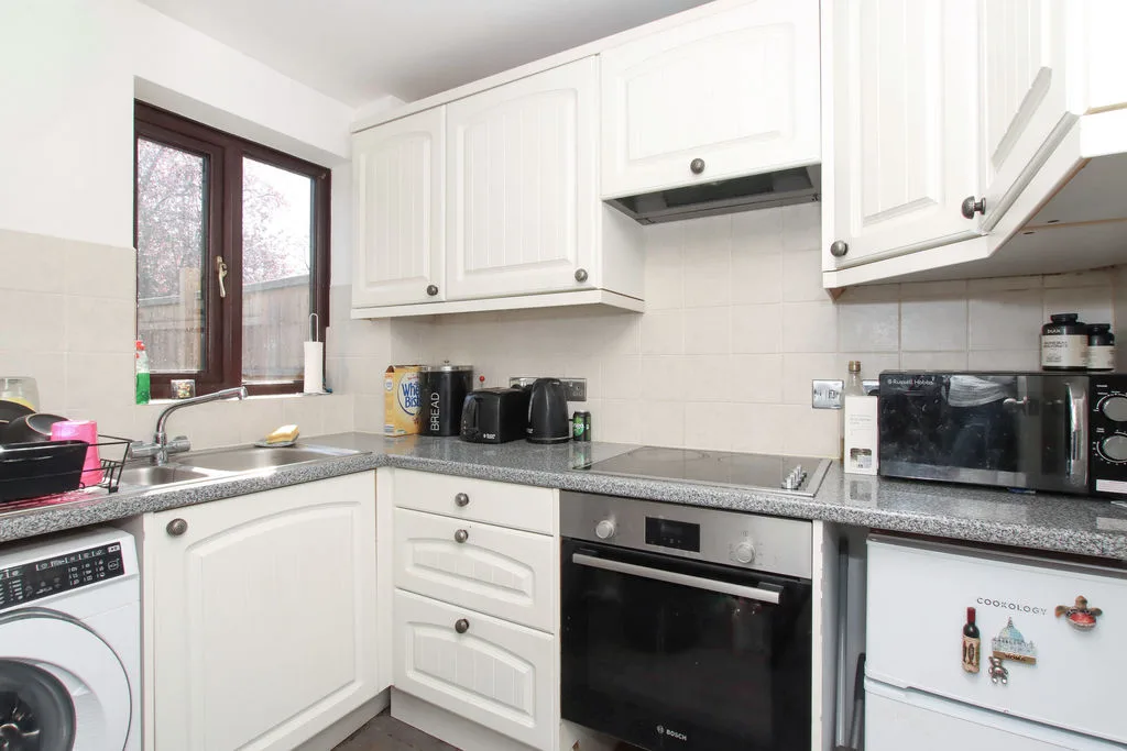 Double glazed window to side aspect. Range of wall mounted and floor standing units with roll edge work surface, one and half stainless steel single drainer sink with mixer tap, integrated oven and induction hob with extractor over, space for washing machine, space for fridge/freezer, understairs storage, radiator, wall mounted boiler.