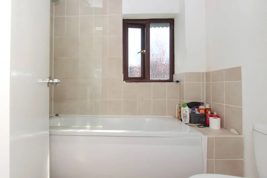 Frosted double glazed window to rear aspect. Low level w.c., panelled bath with shower over, pedestal wash hand basin with mixer tap, radiator, part tiled walls.