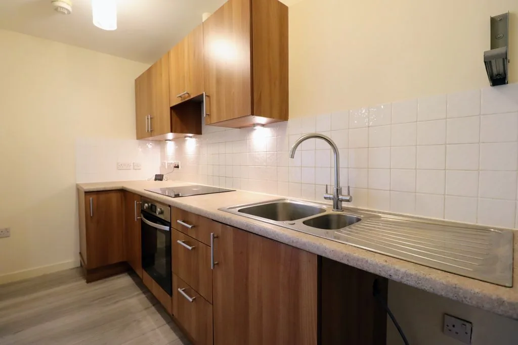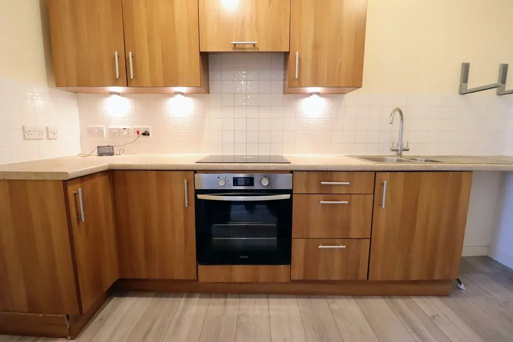Integrated hob and oven, electric hob, electric induction heater and integrated fan, base units, stainless steel sink, space for washing machine, space for fridge freezer, splashback tiling.