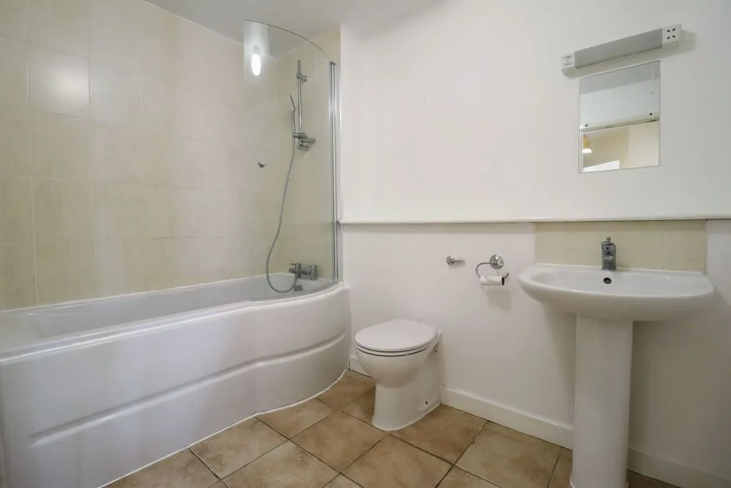 Low level w.c, pedestal hand wash basin, panelled bath with shower attachment over, tiled bath and tiled floor, extractor fan.