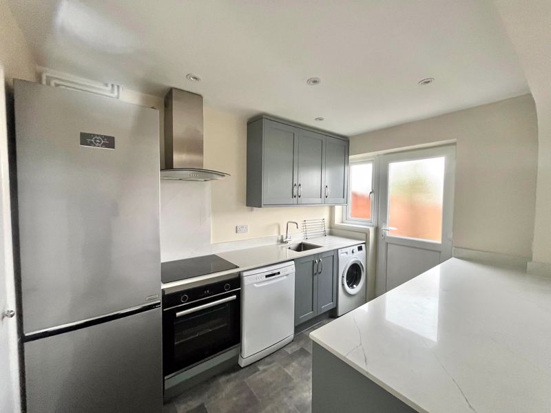 Double glazed windows to front and rear aspects. Range of wall mounted and floor standing units with roll edge work surface over, stainless steel single drainer sink unit with mixer tap, oven and gas hob with extractor over, integrated fridge, freezer and dishwasher, two radiators.