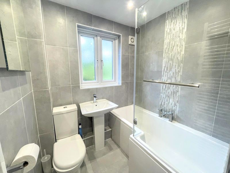 Frosted double glazed window to front. Heated towel rail, tiled walls, low level w.c. , pedestal wash hand basin with mixer tap, panelled bath with shower over.