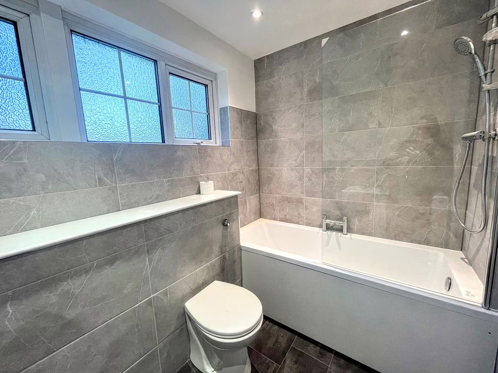 Low level WC, wash hand basin with mixer tap, paneled bath with shower over, radiator, tiled floor, part tiled walls. Double glazed frosted window to front aspect