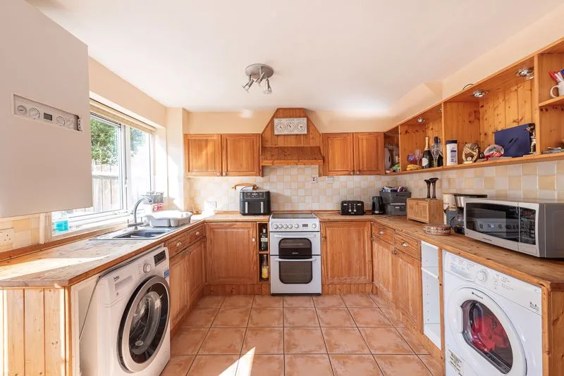 Fitted with single drainer stainless steel sink unit with cupboards below. Further floor and wall mounted units with roll edge work surface over. Part tiled walls. Plumbing for automatic washing machine and tumble dryer, space for fridge freezer, Cooker point. Part tiled walls. Tiled floor. Radiator. Wall mounted gas combination boiler. Double glazed windows and door to rear.
