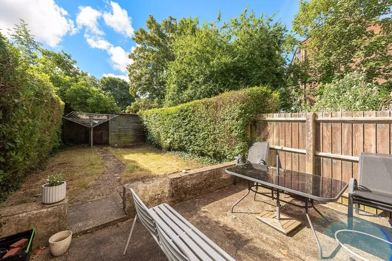 Mainly laid to lawn with patio area and timber storage shed., mature hedge borders and gated rear access.