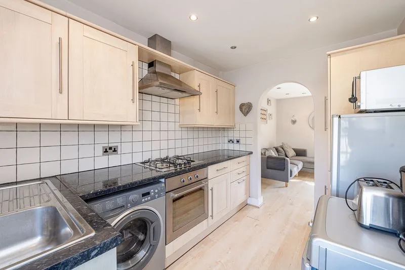 Sash window to front aspect. Fitted with a range of wall-mounted and floor standing units with work surface over, stainless steel sink with drainer and mixer tap, gas hob, integrated oven with extractor over, space for washing machine, fridge freezer and tumble dryer, radiator, open to lounge.
