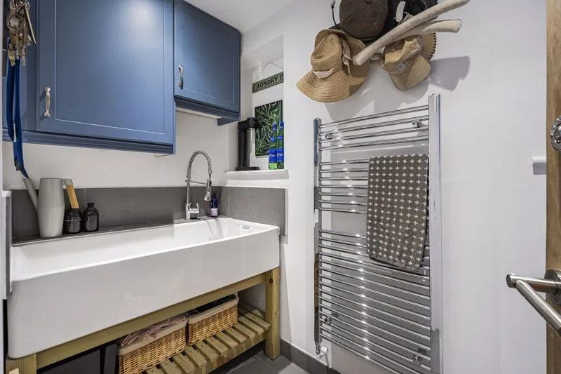 Double glazed frosted window to side aspect. Wall-mounted and floor units with space for washing machine and tumble dryer, heated towel rail, butler sink with mixer tap.