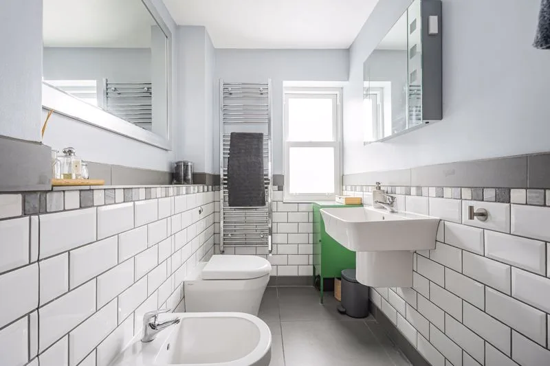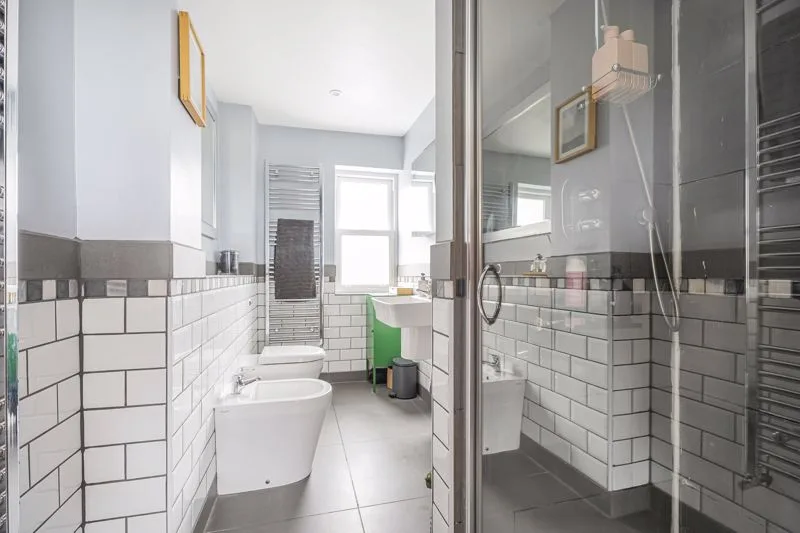 Double glazed frosted window to rear aspect. Tiled shower cubicle, low level WC, bidet, sink with mixer tap, two heated towel rails, tiled floor and walls, extractor fan.