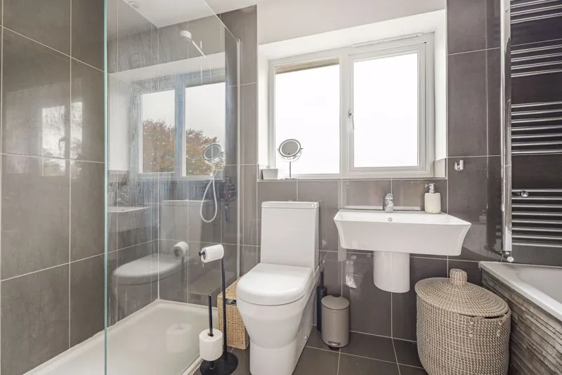 Double glazed window to rear aspect. Panelled bath, low level WC, sink with mixer tap, walk-in tiled shower cubicle, tiled walls and floor, heated towel rail, extractor fan.