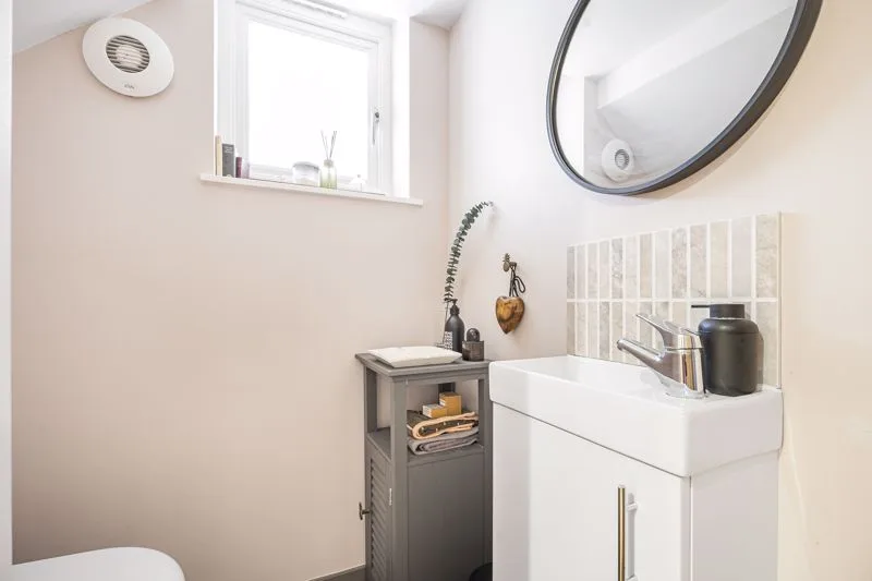 Double glazed frosted window to front aspect. Low level WC, wash hand basin with mixer tap and storage cupboard, radiator, extractor fan.