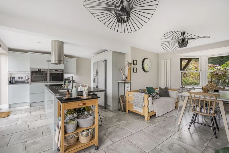 Double glazed bay window to front aspect, two double glazed french doors to rear. Fitted with a range of wall-mounted and floor standing units with rolled edge work surface over, island with sink with drainer, bosch integrated dishwasher, two wall-mounted AEG ovens, hob with extractor fan over, fridge freezer, tiled floor, feature fireplace with log burner, three radiators.