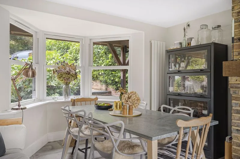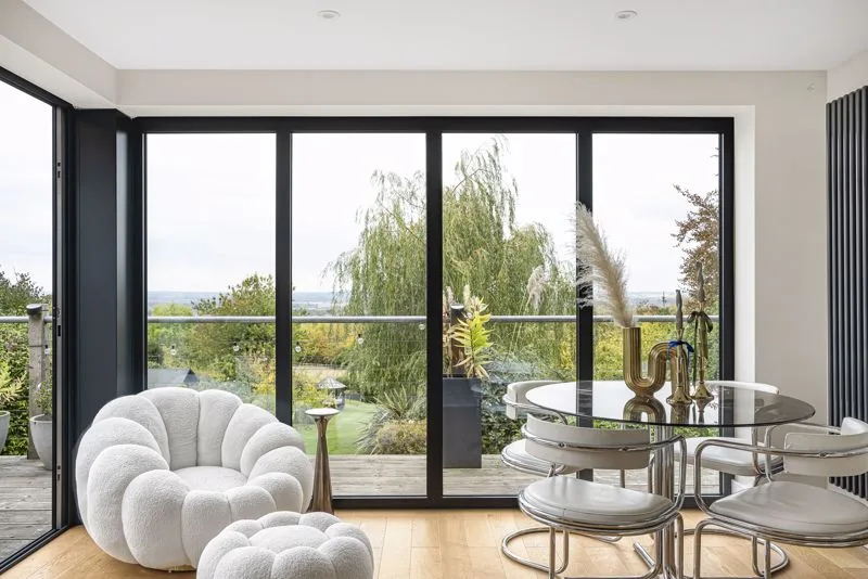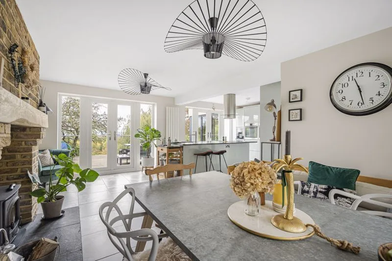Double glazed aluminium bifold doors to side, double glazed picture window to rear aspect. Three radiators, built in hideaway office cupboard, feature fireplace, door leading to passageway to garage.