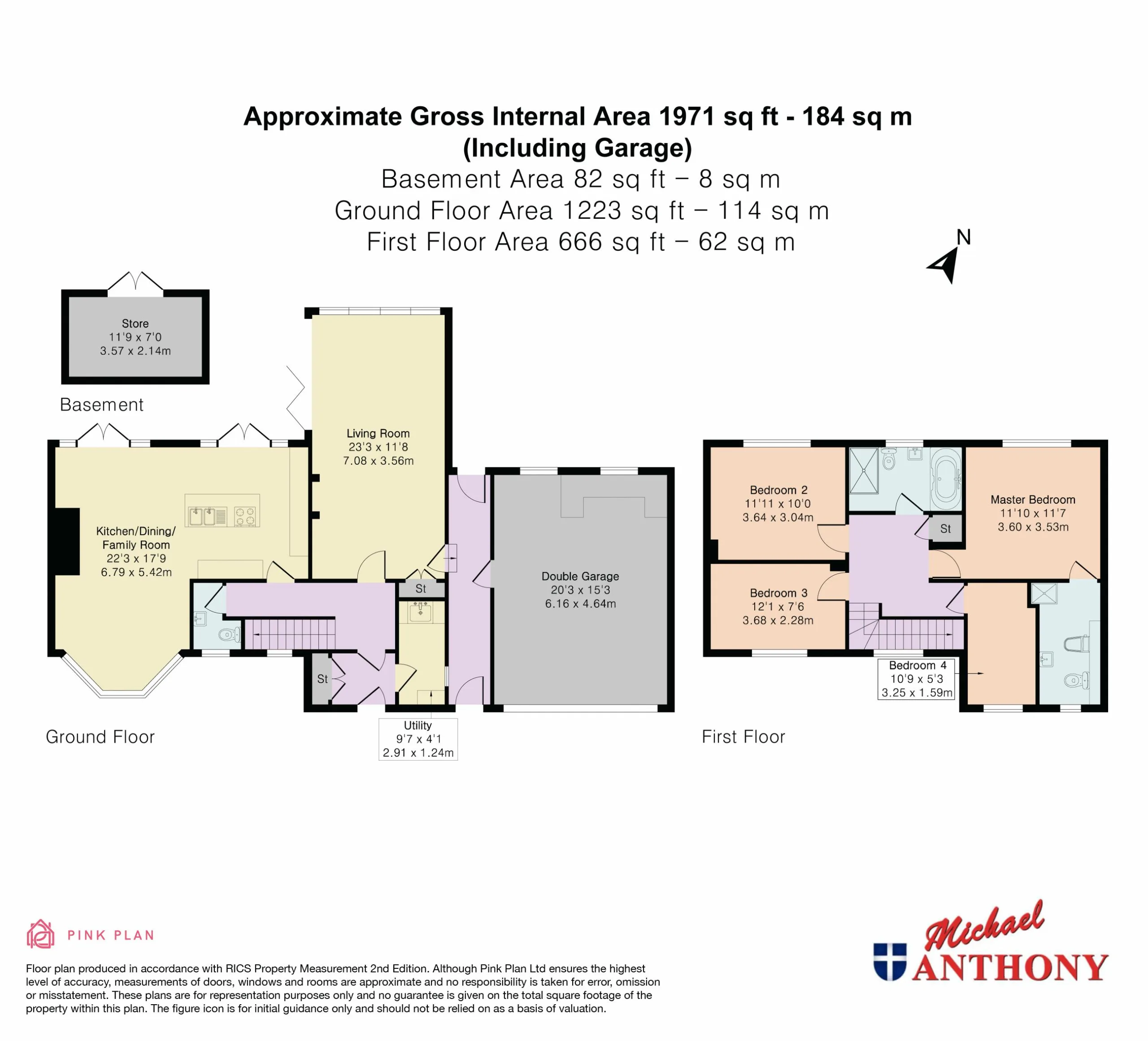 Double garage with up and over door, power and lighting, free standing boiler, space for double fridge freezer, a range of wall-mounted and floor standing units.