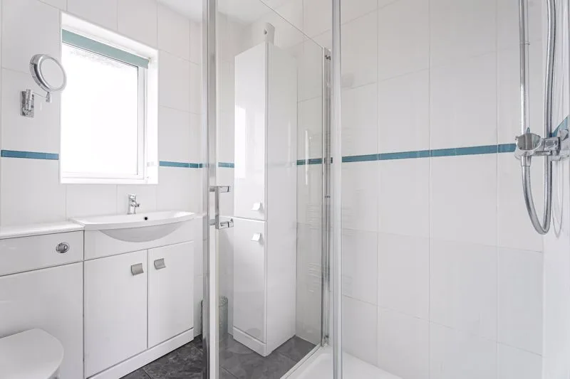Double glazed frosted window to front aspect. Heated towel rail, low level WC with push button flush, fully tiled shower cubicle, wash hand basin in vanity unit.