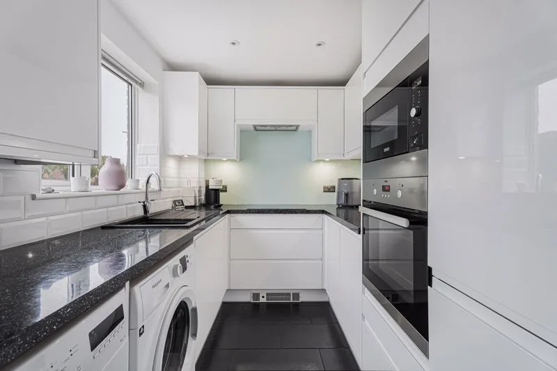 Double glazed window to front aspect. Fitted with a range of base and eye level units with square edge work surface over, splashback tiling, wall-mounted boiler, single drainer sink unit with mixer tap, oven and electric hob with extractor overhead, space for tumble dryer, plumbing for washing machine, integrated appliances including a fridge freezer, microwave and dishwater, warm air vent.