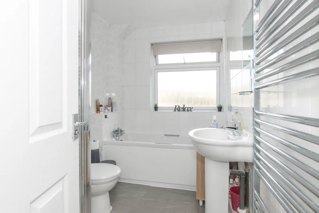 Frosted double glazed window to front, heated towel rail, WC, panel bath, shower cubicle, pedestal hand wash basin.