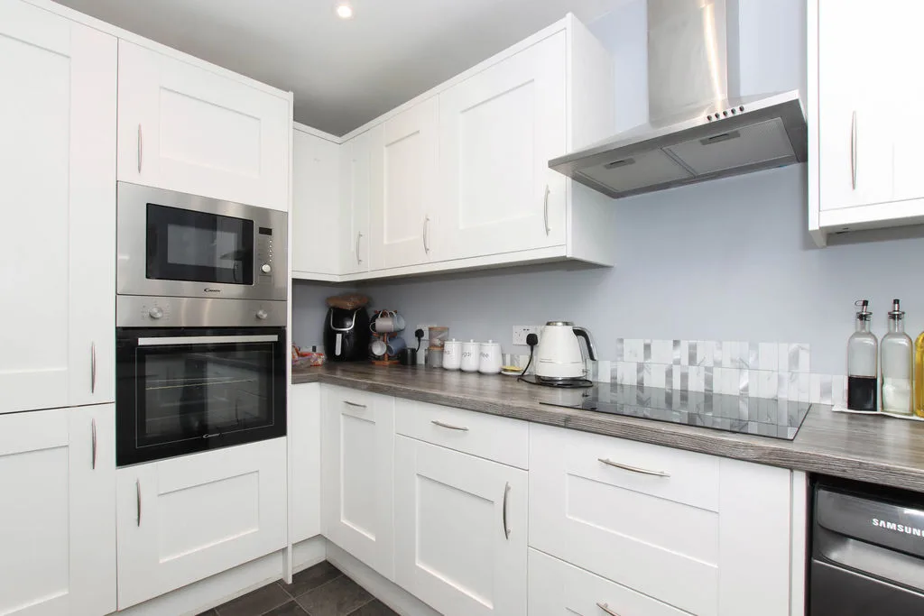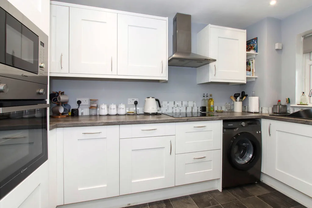 Double glazed window to front, space for washing machine, space for dishwasher, built in microwave, built in oven, electric hob with extractor fan over, storage cupboard, range of floor and wall mounted units, 1 1/2 bowl sink with drainer.