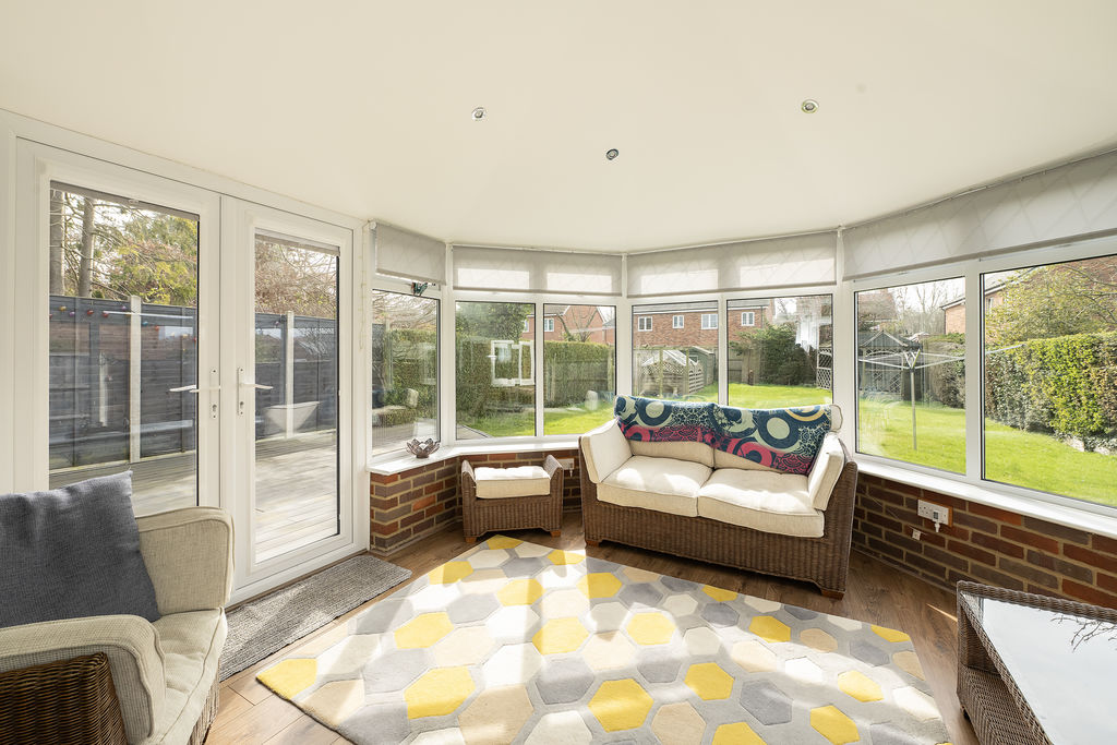 Double glazed conservatory on a brick base with double glazed double doors to garden. Radiator, recessed spotlighting.