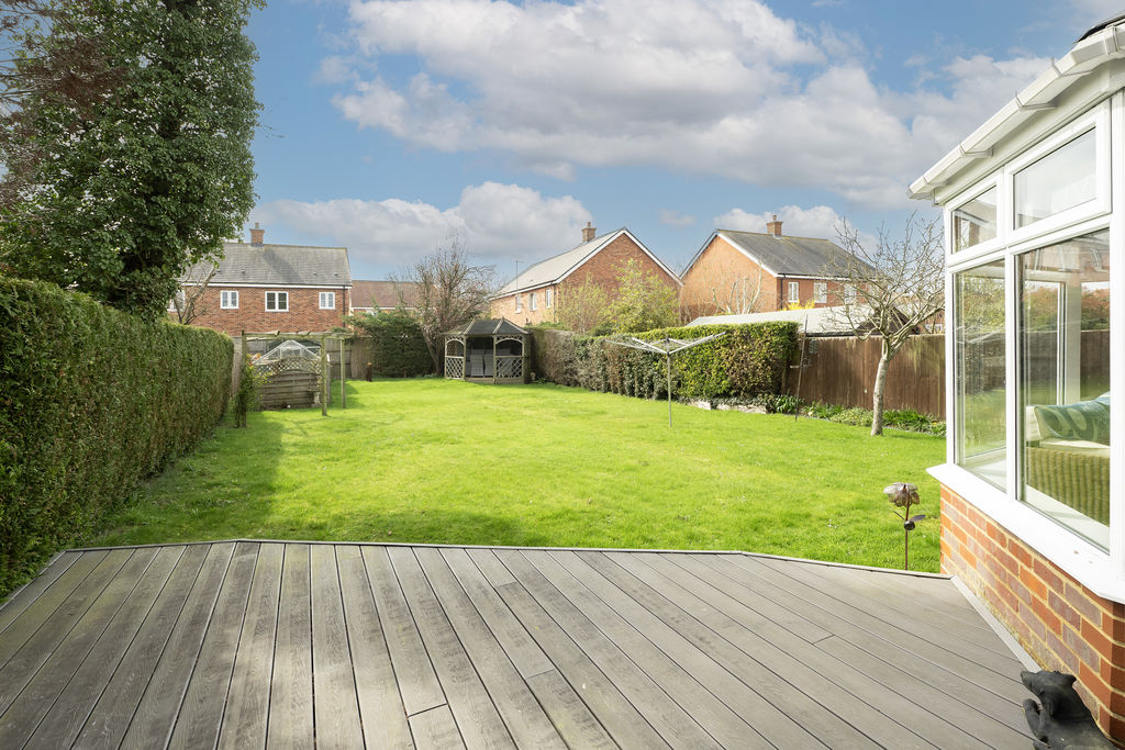 A lovely sized plot which is mainly laid to lawn with large decked patio areas all enclosed by fencing and hedging, outside lighting and cold water tap, gated side access and personal door to garage.