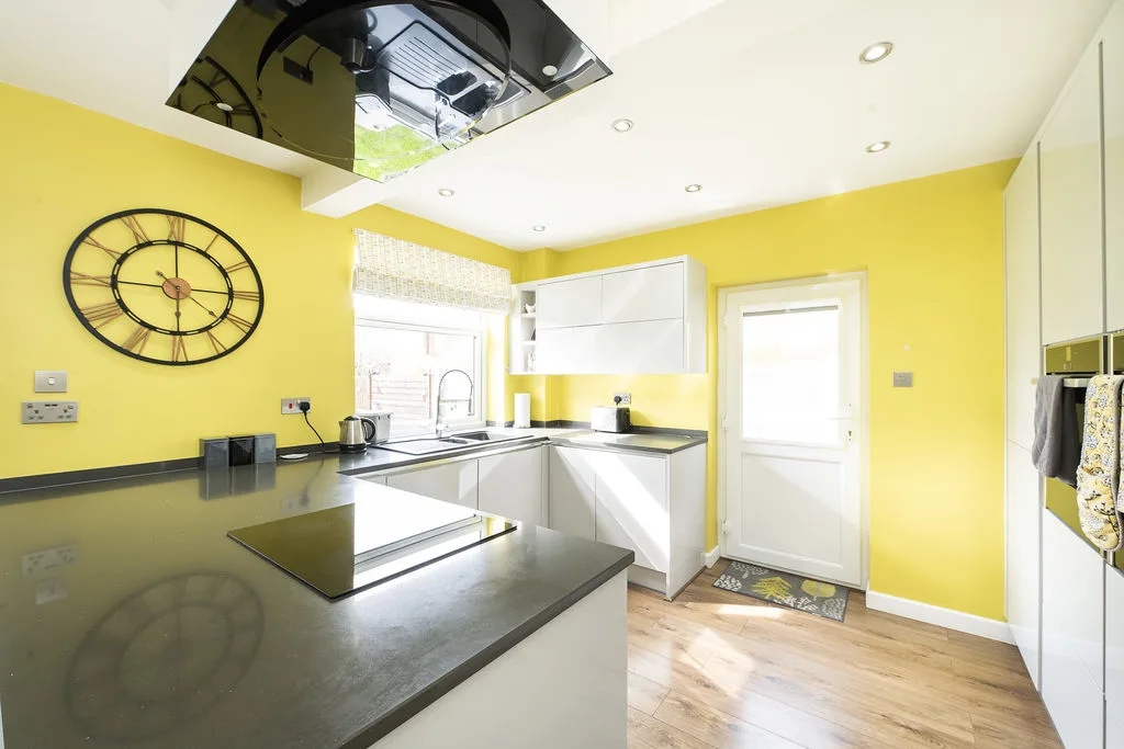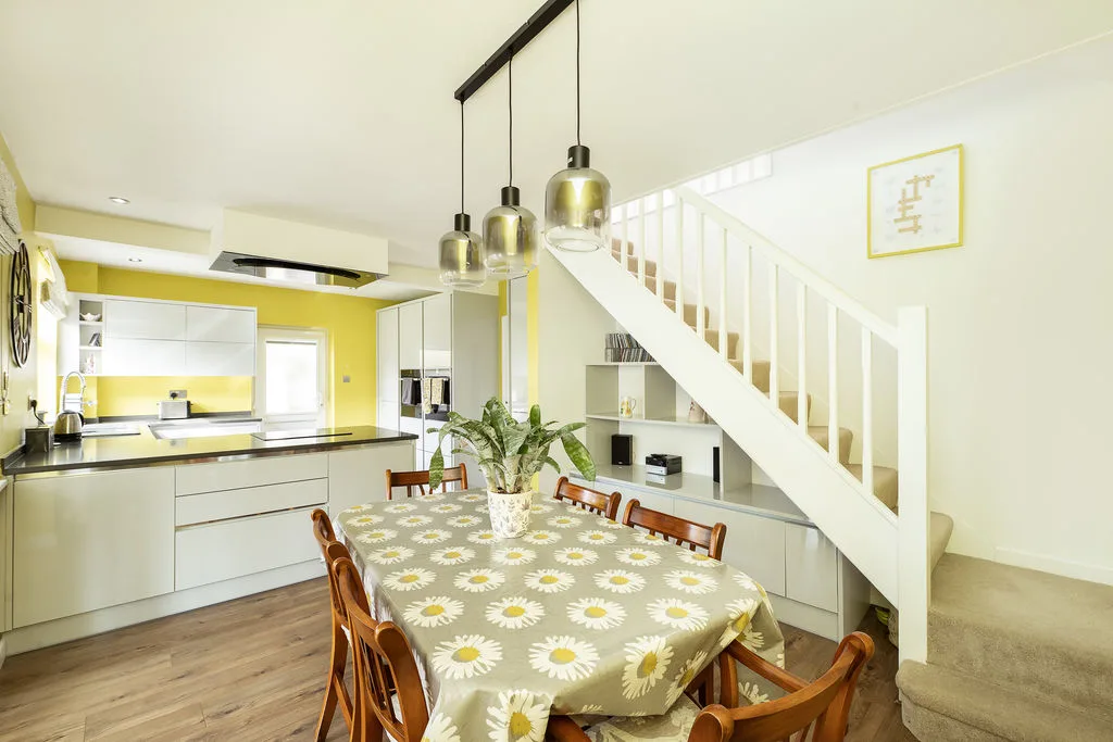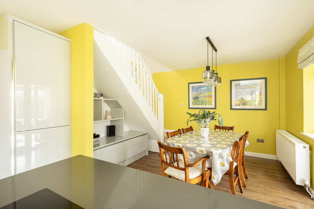 A wonderful open plan room which has been refitted with a range of wall mounted and floor standing units with work surfaces over, one and a half bowl sink with mixer tap, built in double oven and hob with extractor fan over, integrated fridge and freezer, integrated dishwasher, radiator, stairs to first floor. Double glazed French door to side and double glazed double doors to conservatory.