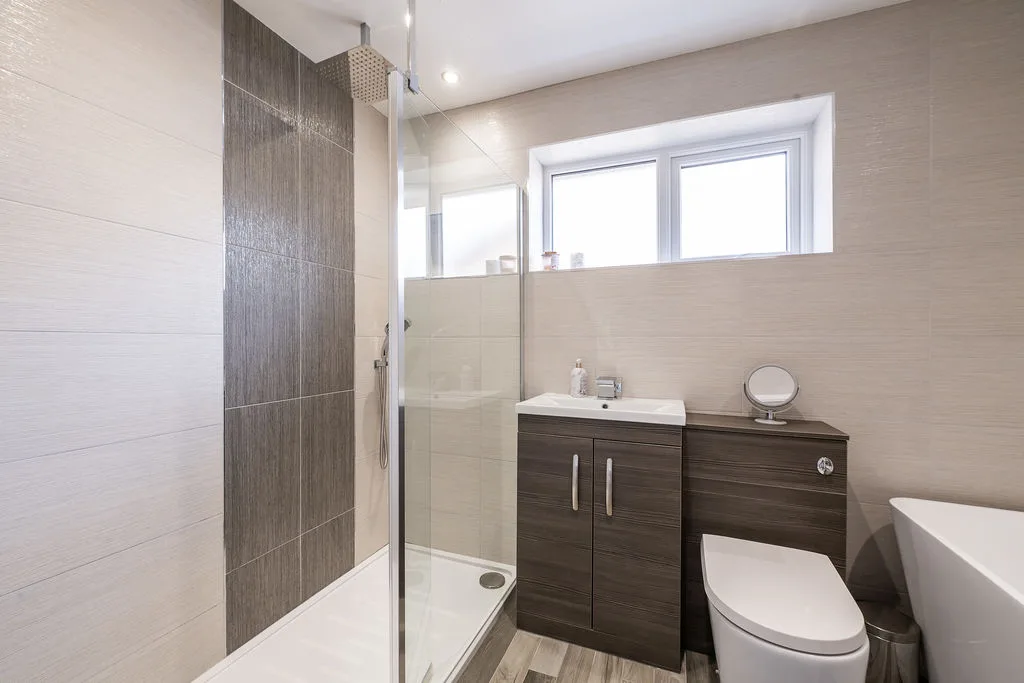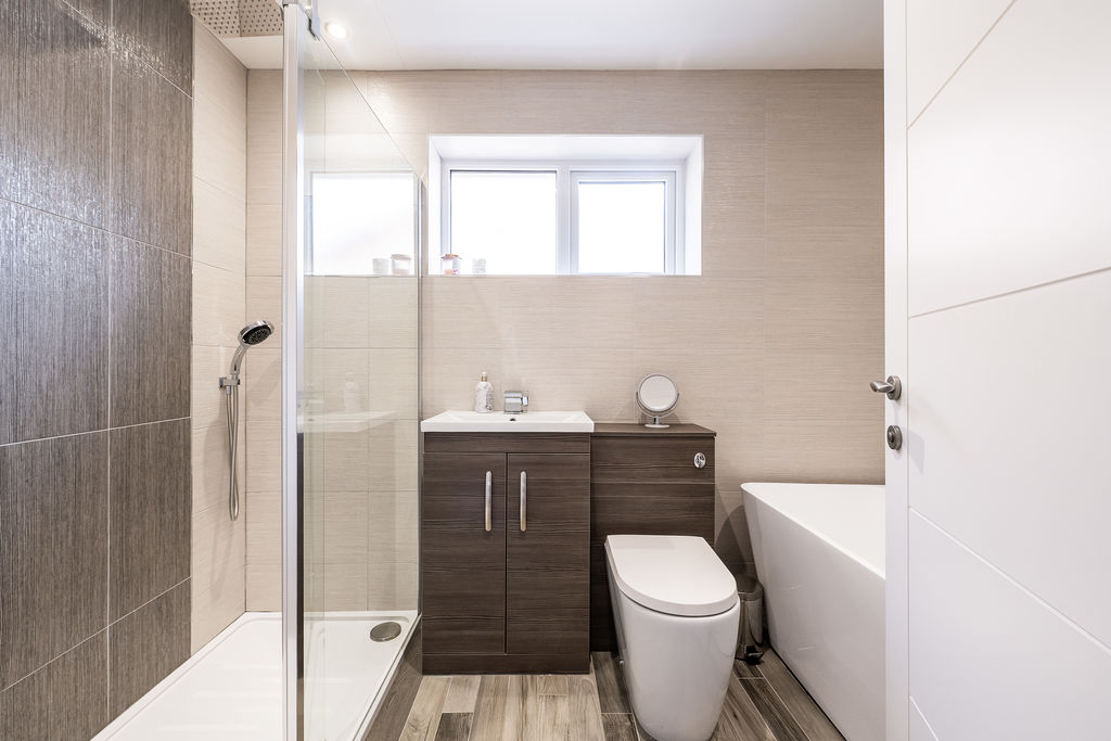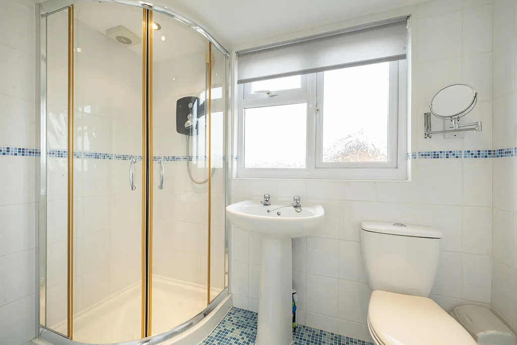 Double glazed frosted window to side aspect. Low level w.c., pedestal wash hand basin, tiled shower cubicle, heated towel rail.