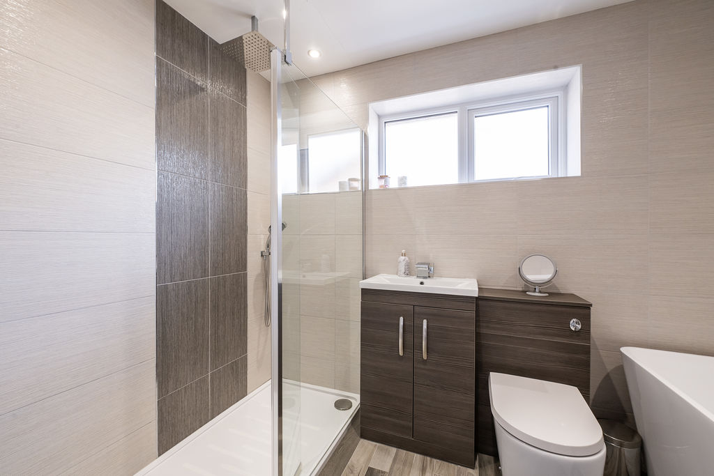 Walk in shower, freestanding bath with mixer tap and shower attachment, wash hand basin, low level w.c., heated towel rail. Frosted double glazed window to side aspect.