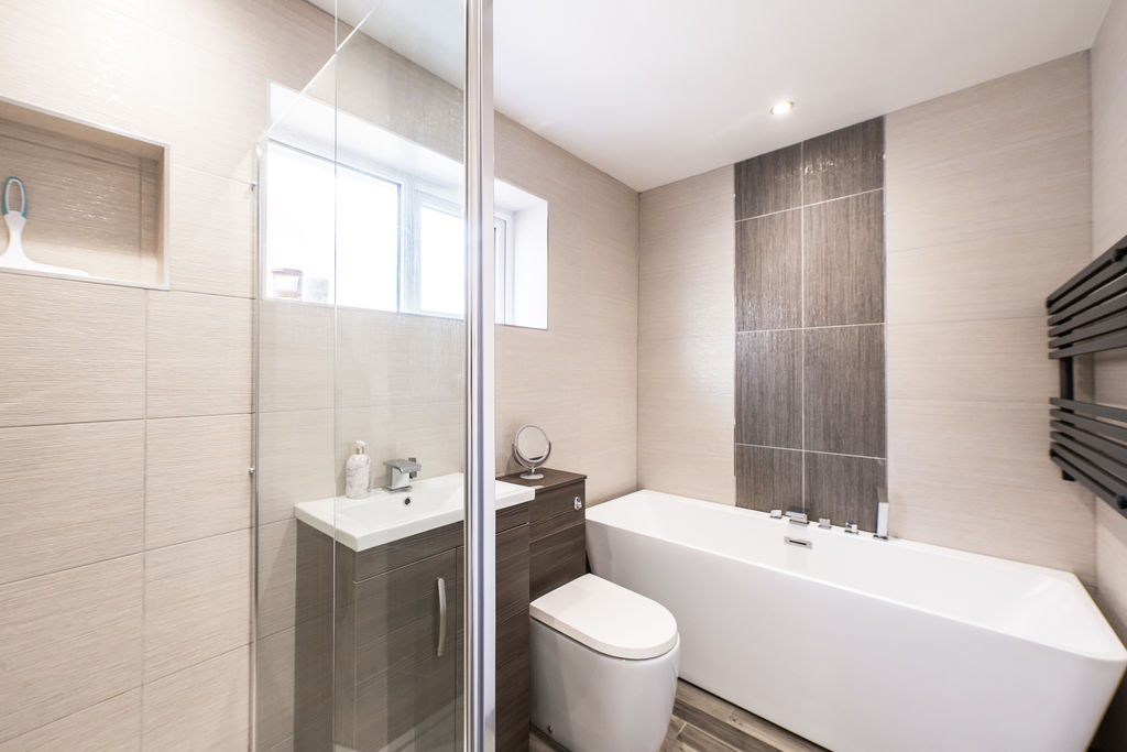 Frosted double glazed window to side aspect. Low level w.c., wash hand basin, plumbing for washing machine space for tumble dryer, heated towel rail.