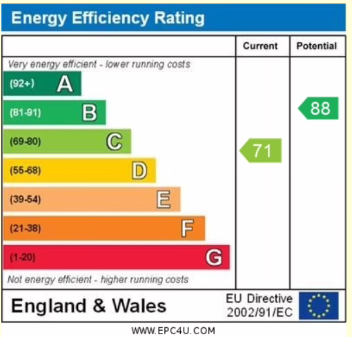 Double glazed frosted window to side aspect. Low level WC with push button flush, heated towel rail, panelled bath with mixer tap and shower attachment, wash hand basin in vanity unit, fully tiled walls.