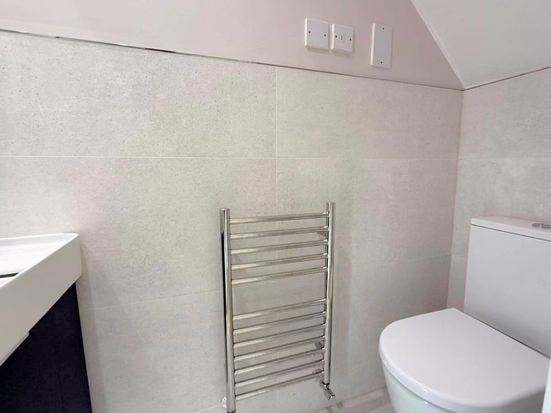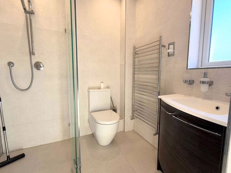 Frosted double glazed window to rear aspect. Shower unit, tiled walls, low level w.c., vanity wash hand basin, heated towel radiator, extractor fan.