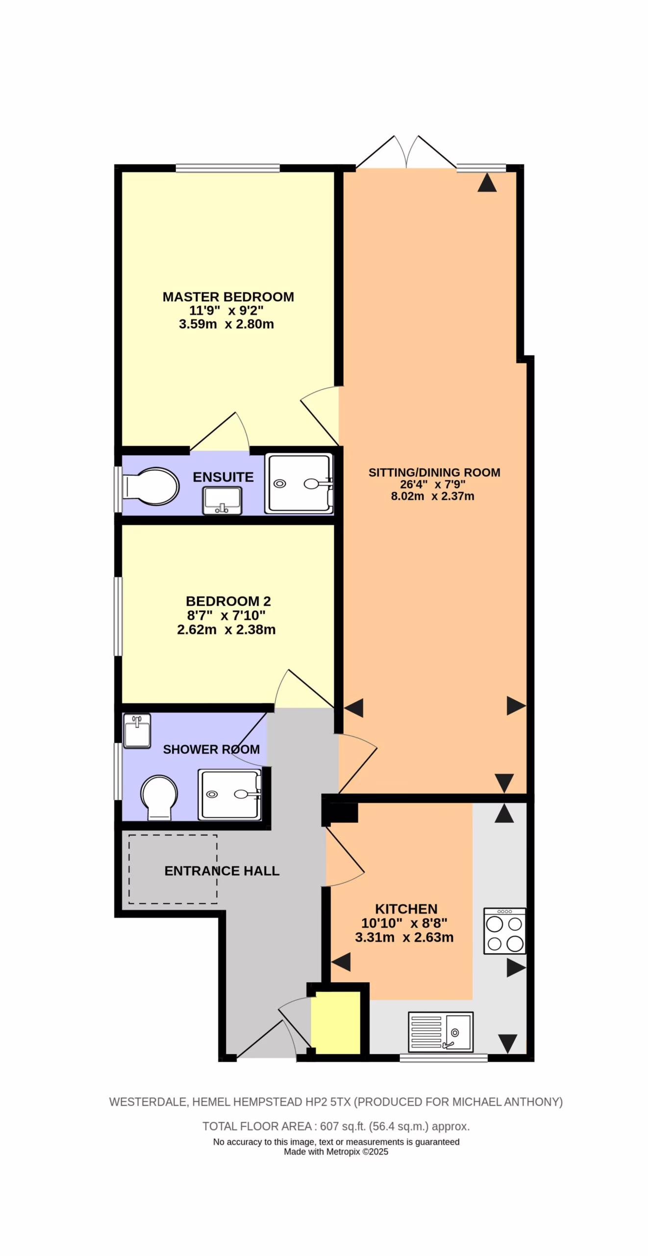 Shower cubicle, WC, hand wash basin in vanity unit, heated towel rail, extractor fan, frosted double glazed window to side.