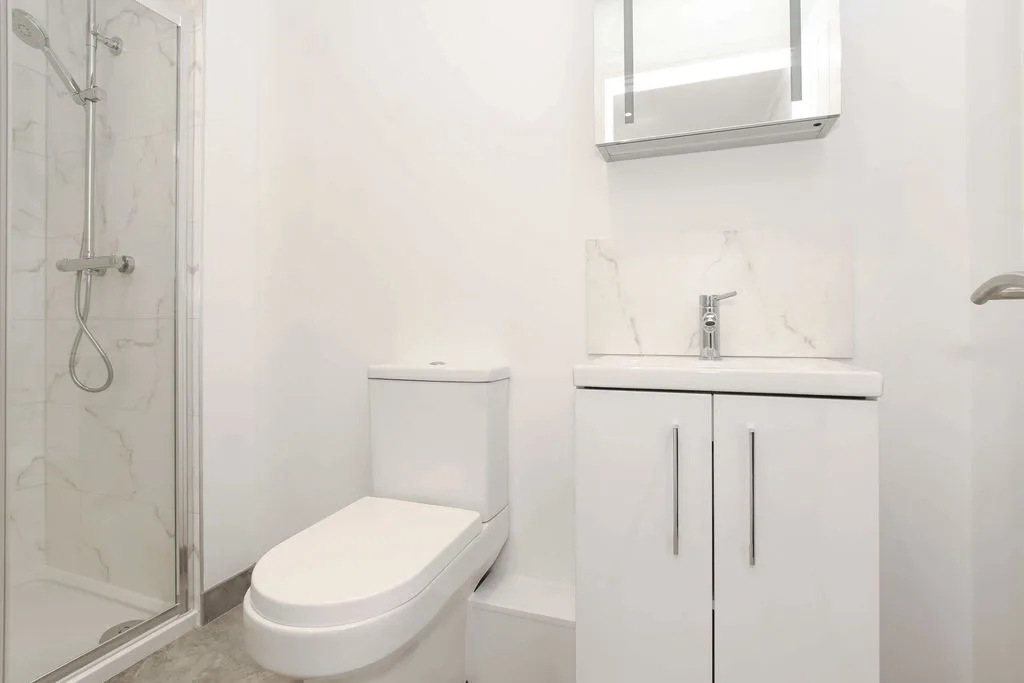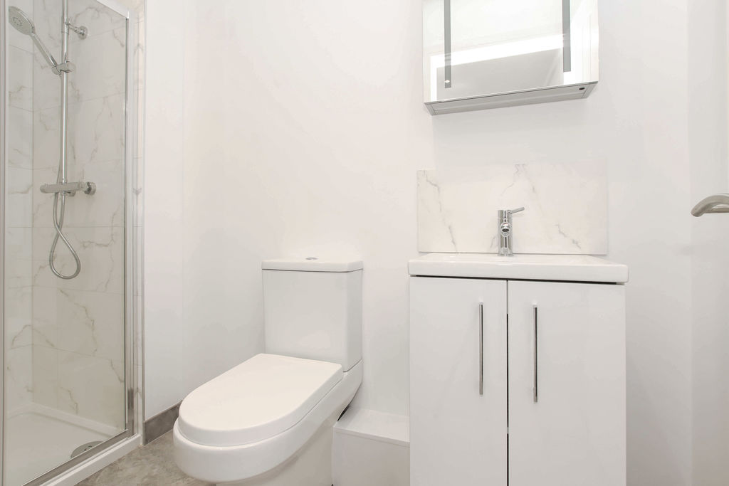 Tiled shower cubicle, low level w.c., sink with mixer tap and storage, heated towel rail, extractor fan, tiled floor.