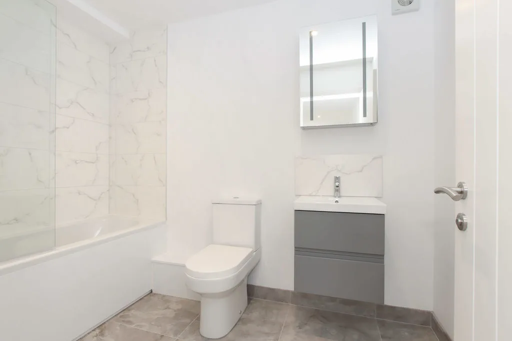 Panelled bath with shower over, low level w.c., sink with mixer tap and storage, heated towel rail, extractor fan, part tiled walls, tiled floor.