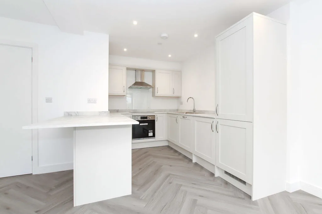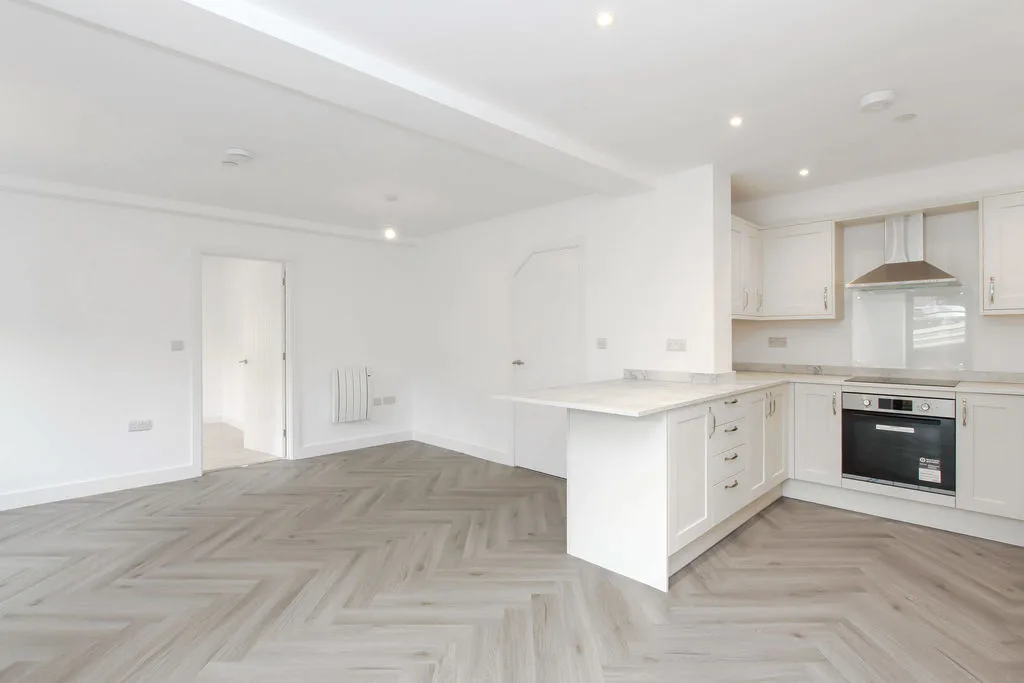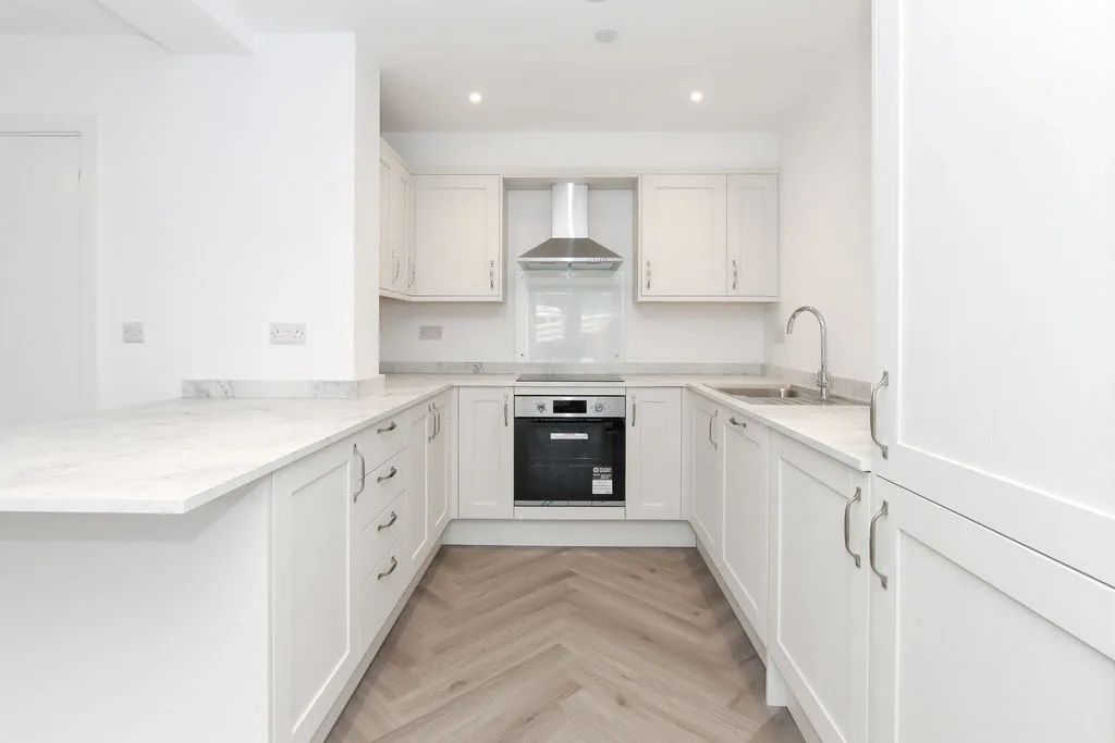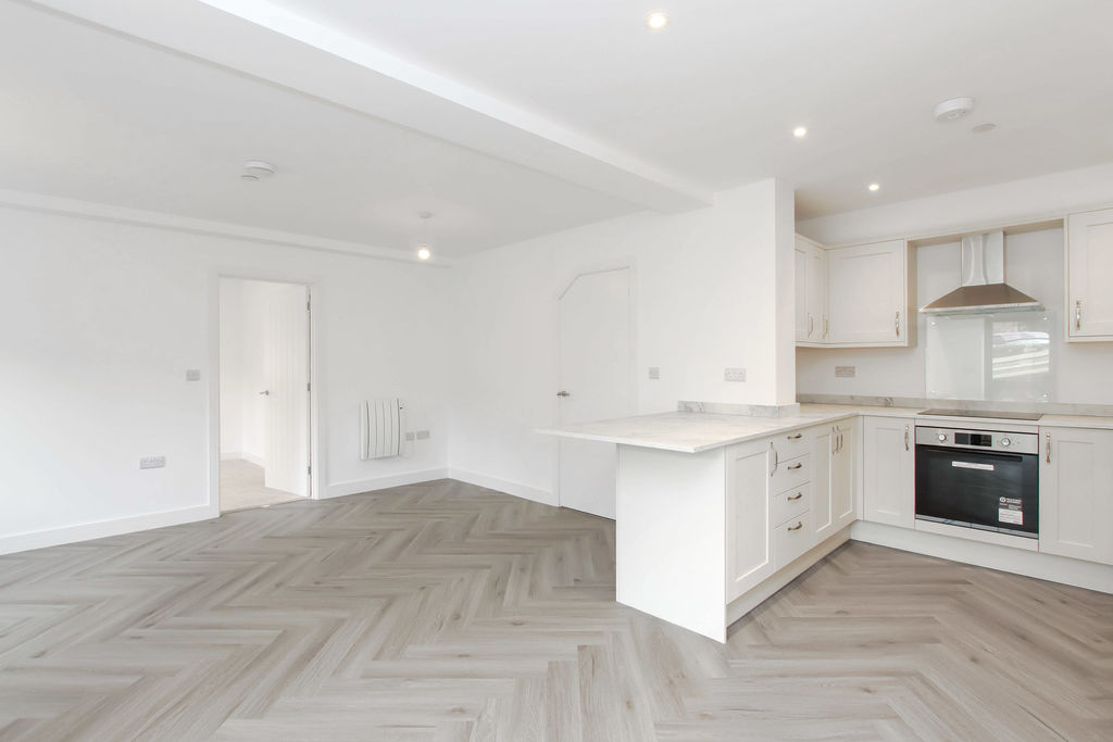 Double glazed window to front aspect. Range of wall mounted and floor standing units with roll top work surface over, stainless steel single drainer sink with mixer tap, integrated oven and hob with extractor fan over, integrated fridge/freezer, dishwasher and washing machine, three electric radiators, storage cupboard housing cylinder.
