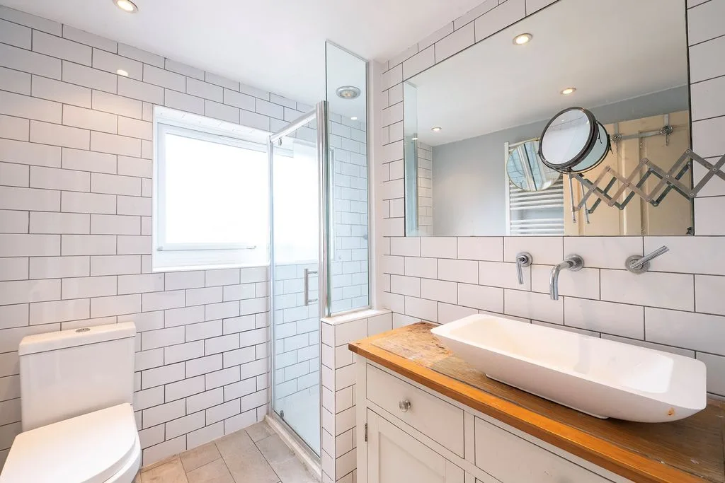 Double glazed frosted window to rear. Tiled shower cubicle, low level w.c, vanity wash hand basin, heated towel rail.