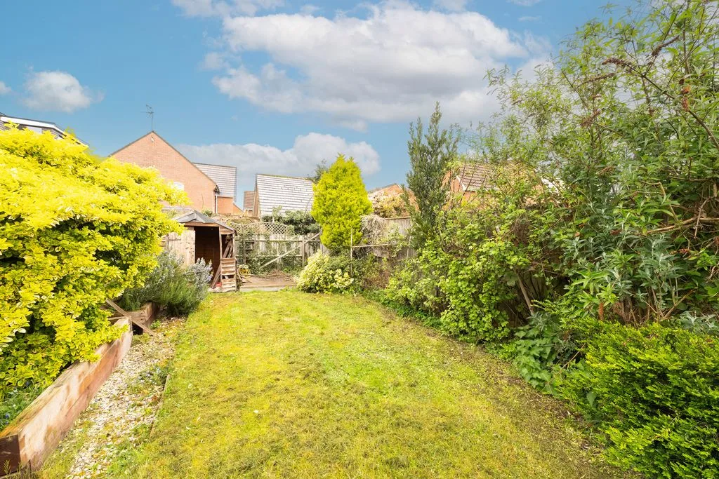 Paved area, mainly laid to lawn, flower and shrub borders, garden shed, decked area, raised shrub bushes, outside light.