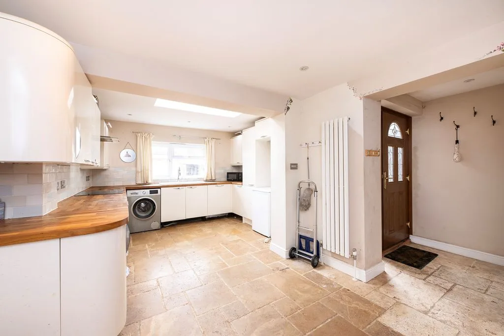 Double glazed window to rear, two double glazed velux windows to rear. Door to w.c. Wall mounted and floor standing units with work surface over. Built in oven and hob with extractor fan over. Plumbing for washing machine, space for fridge freezer