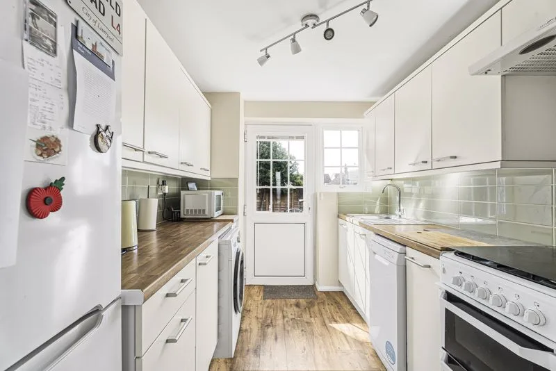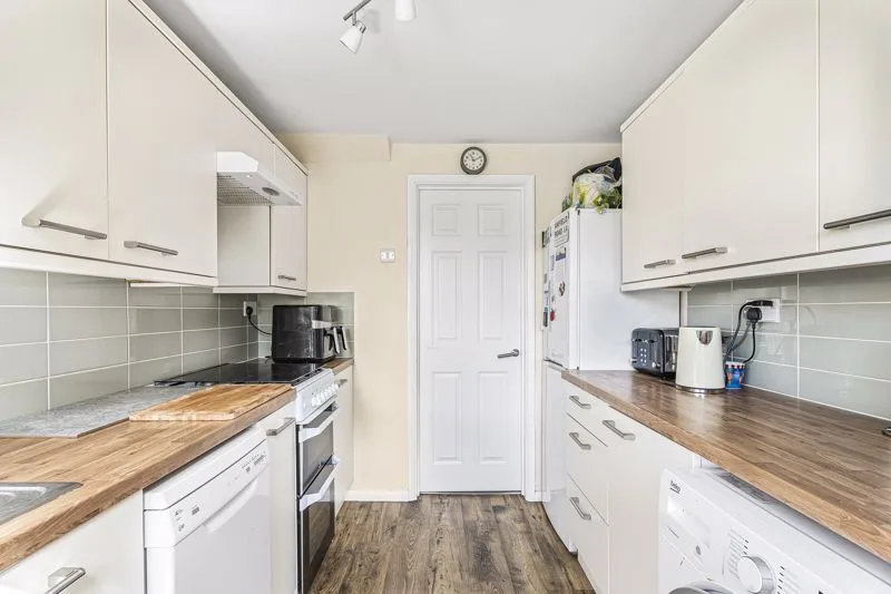 Double glazed window to rear aspect, double glazed door to garden. Fitted with a range of base and eye level units with rolled edge work surface over, stainless steel sink unit, tiled splashback, space for cooker and fridge freezer.