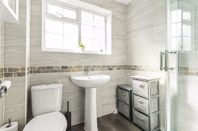 Double glazed window to rear aspect. Heated towel rail, low level WC, pedestal wash hand basin, tiled walls.
