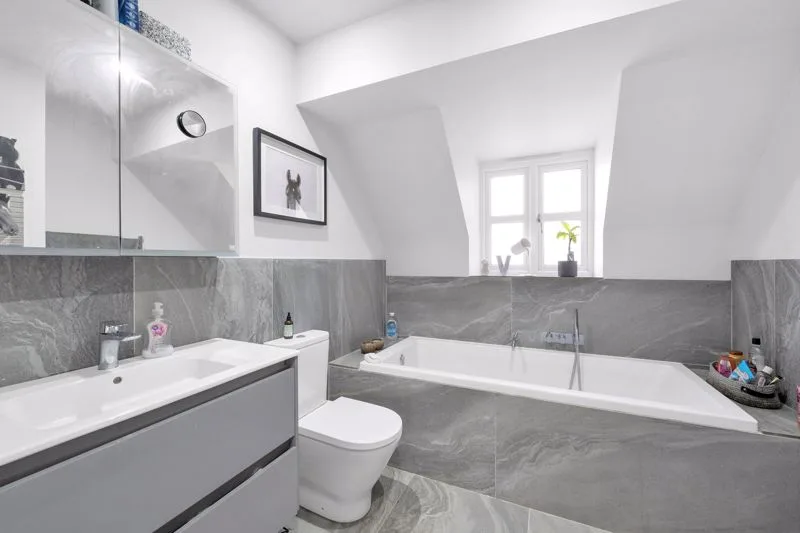 Double glazed frosted window to front aspect. Wash hand basin with mixer tap and storage, low level WC, heated towel rail, bath with shower attachment, tiled floor, part tiled walls, extractor fan.