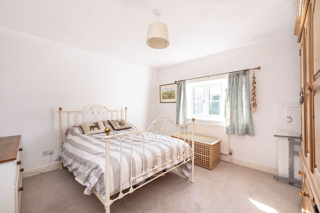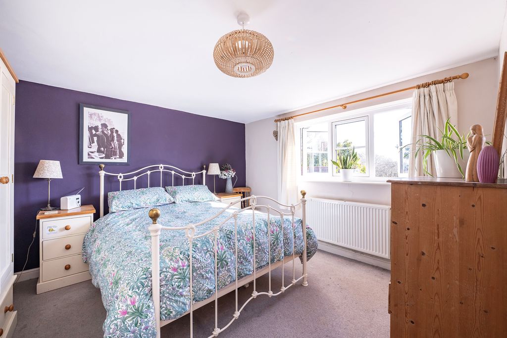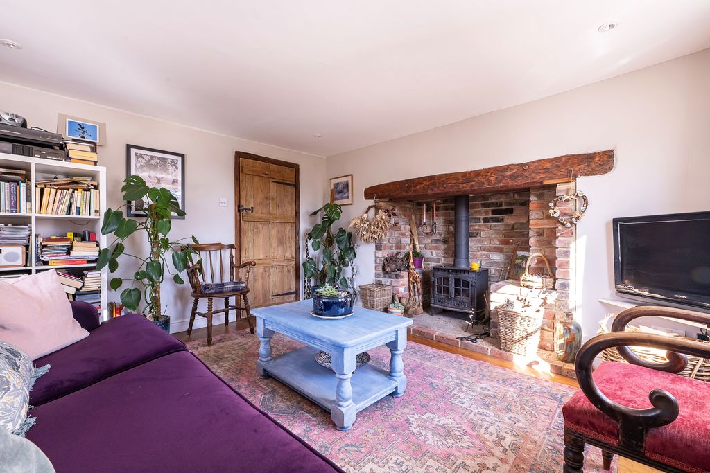 A lovely double aspect room with double glazed windows to both the front and side aspects. Radiator, feature brick built fireplace with stone hearth and fitted wood burner, wooden flooring.
