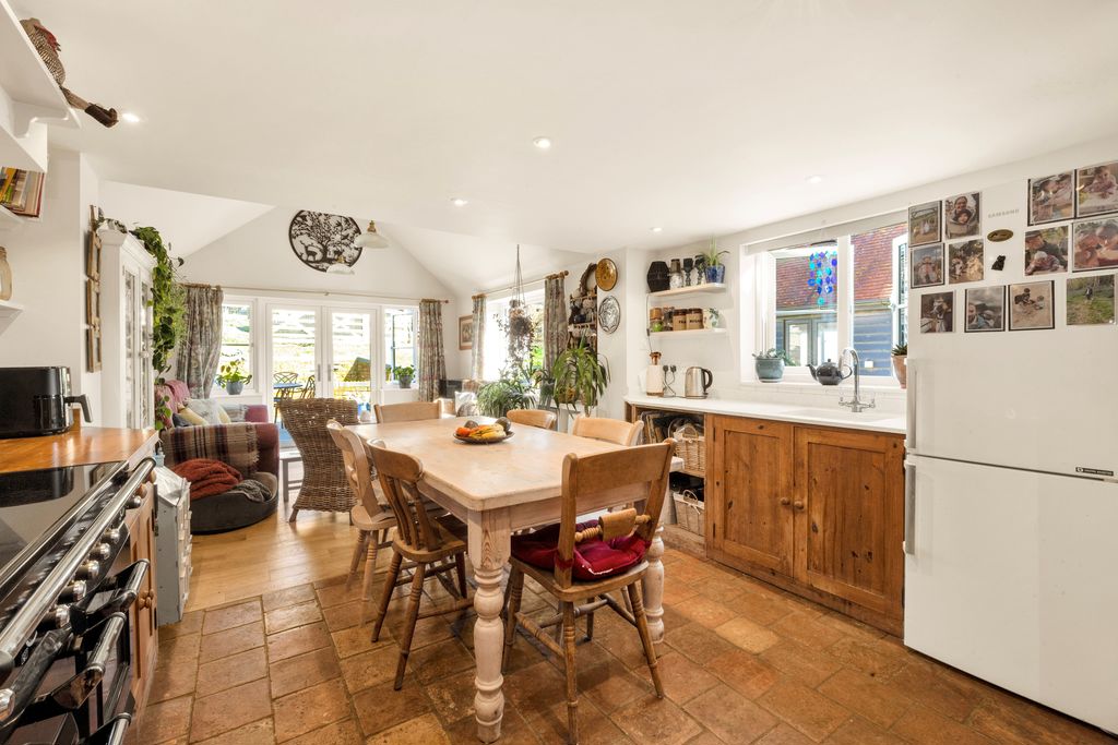 A wonderful vaulted open plan room which is fitted in a farmhouse style with a range of both wall-mounted and floor standing units with wooden and quartz work surface over, space for range cooker with extractor fan over, two ceramic double bowl sink units with mixer tap and drainer, concealed wall-mounted gas fired boiler, built in storage cupboard, underfloor heating, radiator, stone and hardwood flooring. Double glazed double doors and windows to rear and two double glazed windows to side aspect.