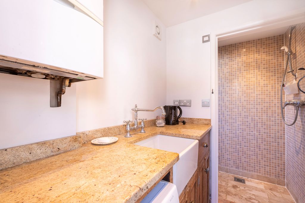 Floor mounted units with granite work surface over, butler sink with mixer tap and drainer, space for washing machine, wall-mounted gas fired boiler, door to wet room, access to loft space, heated towel rail, stone flooring.
