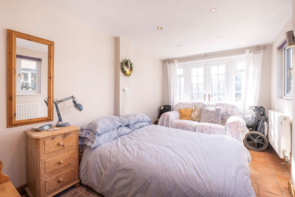 A double aspect room with double glazed double doors and windows to front and double glazed windows to side aspect. Two radiators, stone flooring.