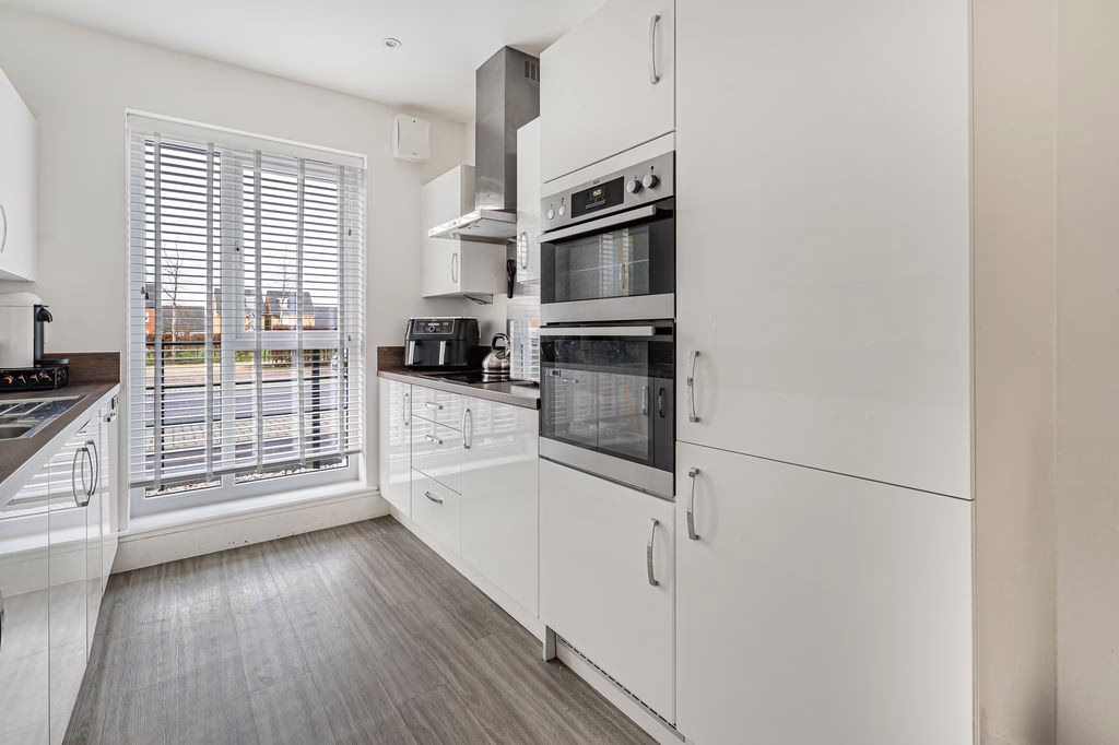 Double glazed window to front aspect, double glazed door to rear. Fitted with a range of base and eye level units with rolled edge work surface over, hob with extractor over, built-in: ovens, dishwasher and fridge freezer; one and a half bowl and drainer sink unit with mixer tap, radiator, door to utility.