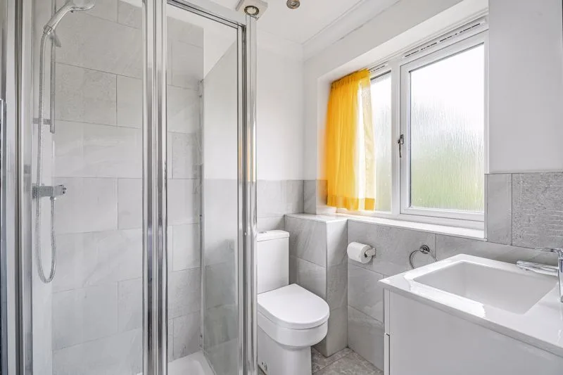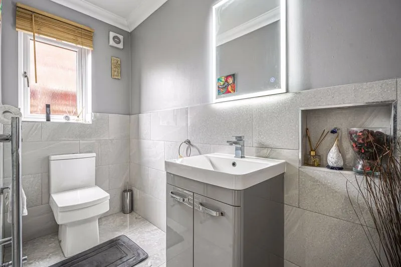 Double glazed frosted window to rear aspect. Low level WC, wash hand basin in vanity unit, heated towel rail, fully tiled shower cubicle.