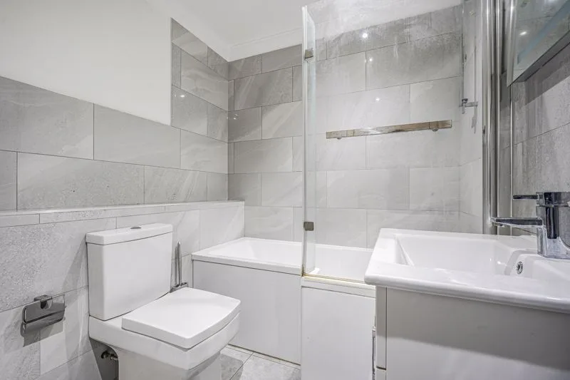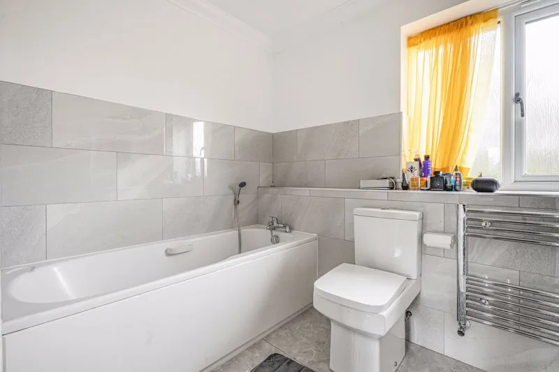 Double glazed frosted window to rear aspect. Low level WC, panelled bath with mixer tap and shower attachment, wash hand basin in vanity unit, heated towel rail, fully tiled shower cubicle.