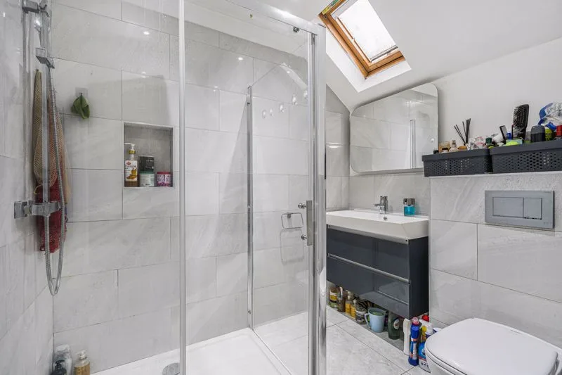 Skylight. Fully tiled shower cubicle, low level WC, heated towel rail, wall-mounted wash hand basin.